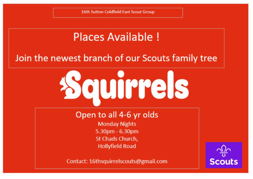 Squirrels 5.30 – 6.30pm (see Uniform groups page for details)