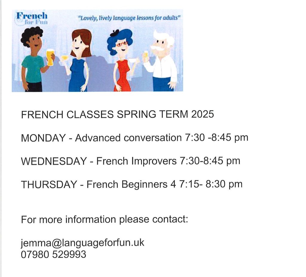 • Adult French Improvers 7.30 – 8.45pm with Jemma Ireland (lounge)