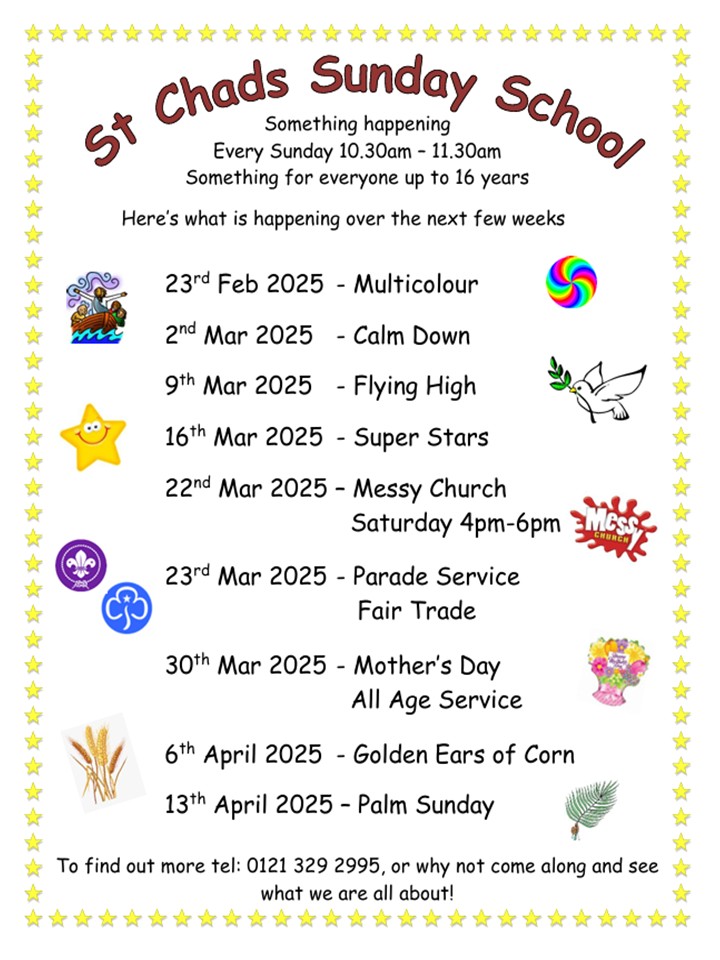 Sunday School is held in St. Chad’s Church Hall, or in the church when it is a wider Family Service.