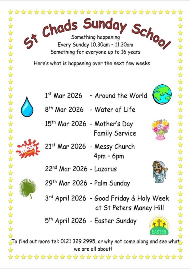 Sunday School is held in St. Chad’s Church Hall, or in the church when it is a wider Family Service.